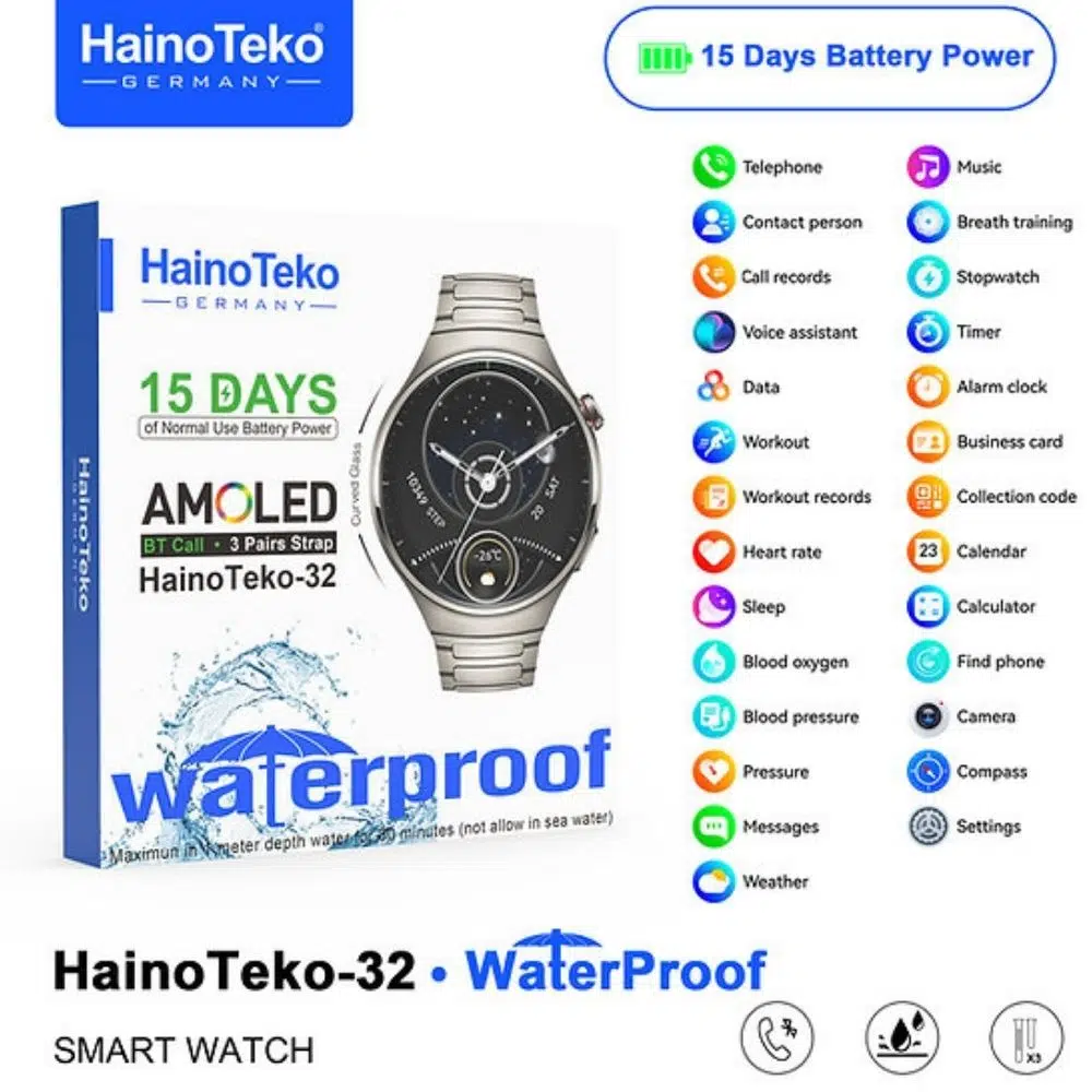 HainoTeko 32, şık metal tasarımı ve AMOLED ekran teknolojisiyle hem klasik saat görünümünü hem de akıllı saat fonksiyonlarını bir arada sunar. Bluetooth arama (BT Call) özelliği sayesinde telefonunuza gelen çağrıları saat üzerinden cevaplayabilir, rehberinizi görüntüleyebilir ve arama kayıtlarını kontrol edebilirsiniz.