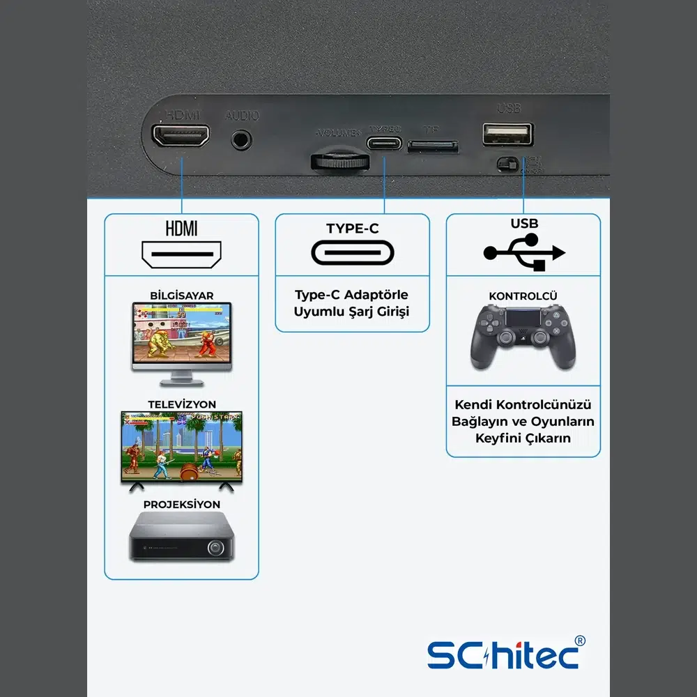 | Etiketler | ScHitec 4KHD 3D Gamebox Arcade 48 Emülatörlü Oyun Konsolu Pandora Atari 50000 Oyun TV Baglanan HABL1 |