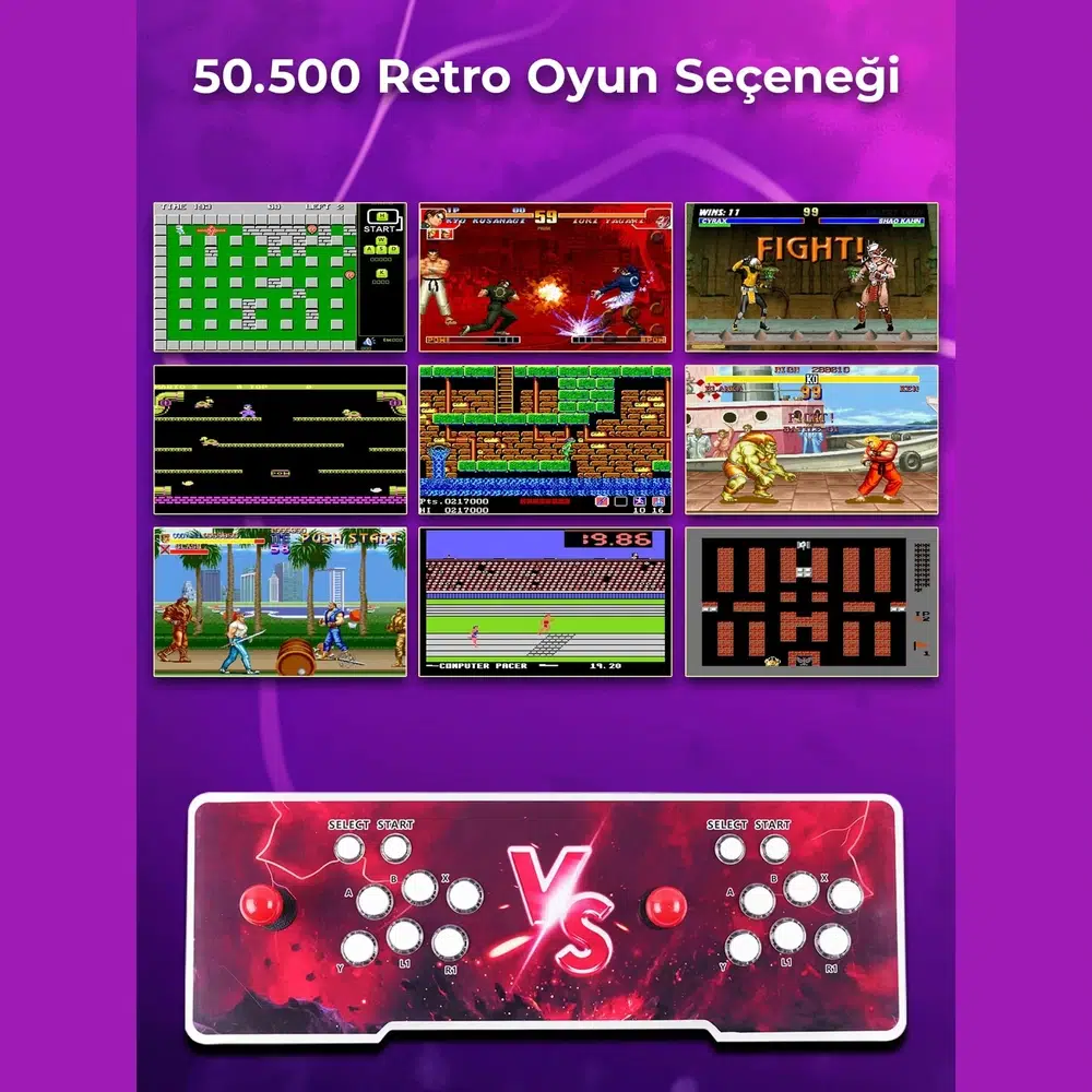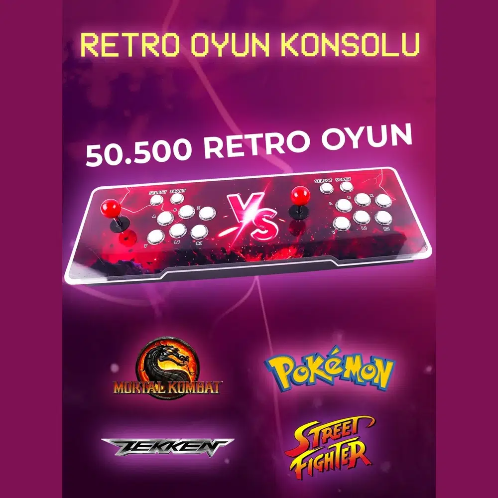 PlayStation 1, PSP, Neo-Geo, MAME, FBA, SFC, MD, FC ve DC dahil birçok platform desteği sayesinde Tekken, Street Fighter, Mortal Kombat, King of Fighters, Metal Slug, Super Mario, Sonic, Batman ve daha binlerce oyun tek sistemde toplanır. Kol ve tuş ayarlarının önceden yapılmış olması ekstra kurulum ihtiyacını azaltırken, oyunu durdurup kaydetme ve kaldığınız yerden devam etme özelliği kullanım deneyimini daha pratik hale getirir. Cihazı kapatmadan oyun değiştirme desteği ise eğlenceyi kesintisiz sürdürmeye yardımcı olur.